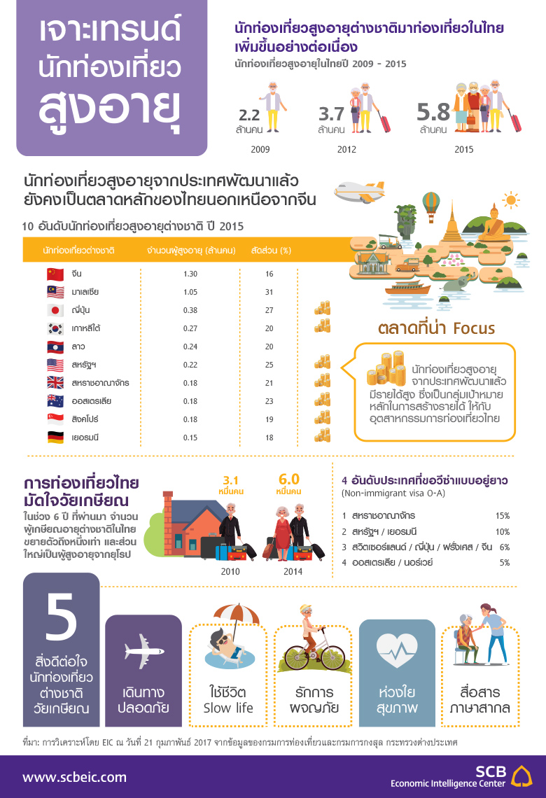 สัดส่วนนักท่องเที่ยวสูงอายุที่เพิ่มขึ้นเร็วกว่าวัยอื่นๆ พร้อมกับการเข้าสู่สังคมสูงอายุ ทำให้เป็นกลุ่มตลาดที่น่าจับตามองสำหรับธุรกิจท่องเที่ยว นักท่องเที่ยวสูงอายุมีกำลังซื้อและเวลาว่าง ซึ่งเป็นโอกาสให้กับธุรกิจท่องเที่ยว ทั้งนี้ สองกลุ่มหลักที่มีศักยภาพ คือ นักท่องเที่ยวสูงอายุและผู้เกษียณอายุต่างชาติ ซึ่งกลุ่มนักท่องเที่ยวสูงอายุจะมีค่าใช้จ่ายท่องเที่ยวต่อคนต่อทริปสูงกว่านักท่องเที่ยวทั่วไป นอกจากนี้ จำนวนนักท่องเที่ยวสูงอายุที่เพิ่มขึ้นยังส่งผลให้จำนวนผู้เกษียณอายุต่างชาติในไทยเพิ่มขึ้นตามอย่างมีนัยสำคัญ ทั้งนี้ ในปัจจุบันไทยสามารถขยายตลาดนักท่องเที่ยวเกษียณอายุต่างชาติที่มีศักยภาพ อาทิ สหราชอาณาจักร สหรัฐฯ ญี่ปุ่น และ เยอรมนี เป็นต้น