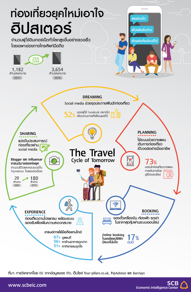 พัฒนาการของเทคโนโลยีออนไลน์และดิจิทัลต่างๆ ทำให้พฤติกรรมการท่องเที่ยวเปลี่ยนไป โดยเฉพาะเอื้อให้การเดินทางท่องเที่ยวด้วยตัวเอง (Freely Independent Traveler : FIT) เป็นไปได้ง่ายขึ้น ซึ่งส่งผลให้นักท่องเที่ยวอ่อนไหวต่อราคา และกลยุทธ์การตลาดในสื่อออนไลน์ทวีความสำคัญ รวมถึงธุรกิจเผชิญกับคู่แข่งใหม่ๆ เช่น การจองผ่านแพลตฟอร์มออนไลน์ที่ช่วยให้การเปรียบเทียบราคาสะดวกขึ้น แต่ขณะเดียวกันก็ทำให้นักท่องเที่ยวมีความอ่อนไหวต่อราคามากขึ้นตามไปด้วย นอกจากนี้เทคโนโลยียังทำให้รูปแบบการทำการตลาดของธุรกิจท่องเที่ยวหันมาใช้ blogger หรือ influencer เพื่อแชร์ประสบการณ์และเสริมสร้างภาพลักษณ์ นอกจากนี้ การพัฒนาทางเทคโนโลยียังก่อให้เกิดโมเดลธุรกิจใหม่ เช่น Airbnb ที่เปิดโอกาสให้เจ้าของที่พักส่วนตัวนำห้องพักมาปล่อยเช่าแก่นักท่องเที่ยวนั้นจนส่งผลกระทบต่อธุรกิจโรงแรมโดยเฉพาะโรงแรมระดับกลาง-ล่าง ซึ่ง Airbnb มีโอกาสเข้ามาเป็นคู่แข่งหลักกับตลาดโรงแรมในไทยในอนาคต โดยเฉพาะในกลุ่มนักท่องเที่ยวจีนที่หันมาใช้ Airbnb มากขึ้นกว่า 1 ล้านคน รวมถึงการขยายตัวของห้องพัก Airbnb ในกรุงเทพฯ ที่สูงกว่า 100%