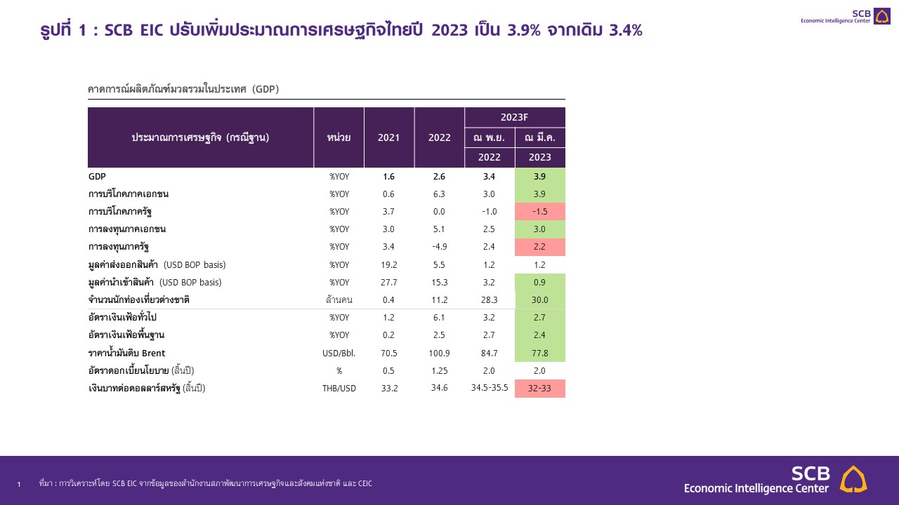 SCB EIC ประเมินว่า เศรษฐกิจไทยในปี 2023 มีแนวโน้มขยายตัวได้ดีกว่าที่เคยประเมินไว้